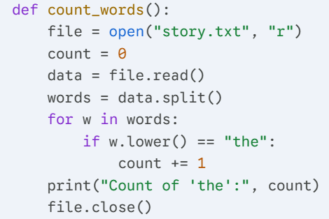 - Text Files: Write a function to count specific words (example, words starting with 'A' or 'The') or count vowels/consonants.
