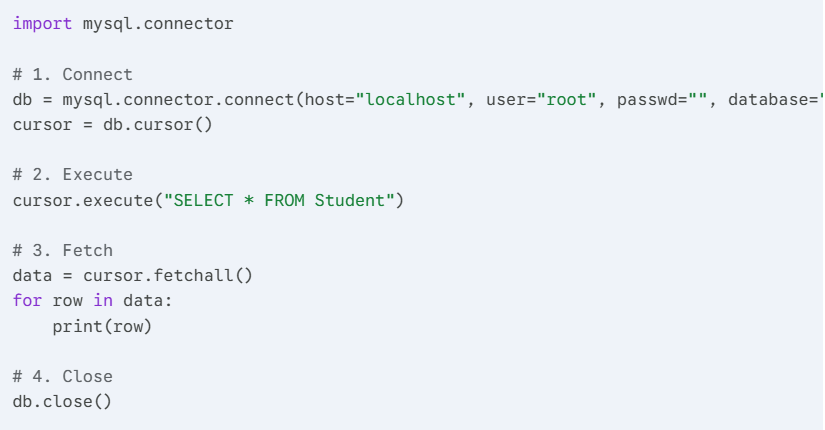 - Expect questions on the steps to connect (connection object, cursor, execute(), and fetchall() vs fetchone()).