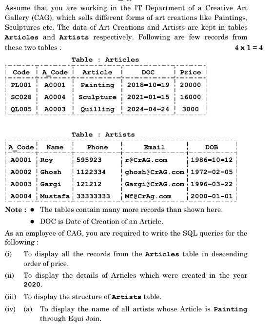 - Joins: A 3-mark query requiring you to fetch data from two tables using a common column (Equi-Join).