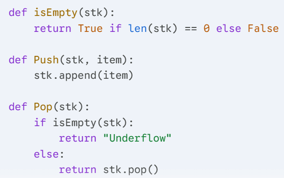 - Stacks: Implementing Push and Pop operations using a Python List. You will almost certainly be asked to write a function that filters elements (e.g., "Push only numbers divisible by 5 onto the stack").