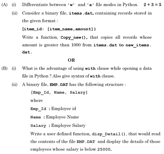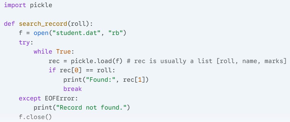 - Binary Files (pickle module): A 5-mark question involving dump() and load(). Usually, it asks you to "Search and Display" or "Update" a record (like a student's marks or an employee's salary) based on a Unique ID.