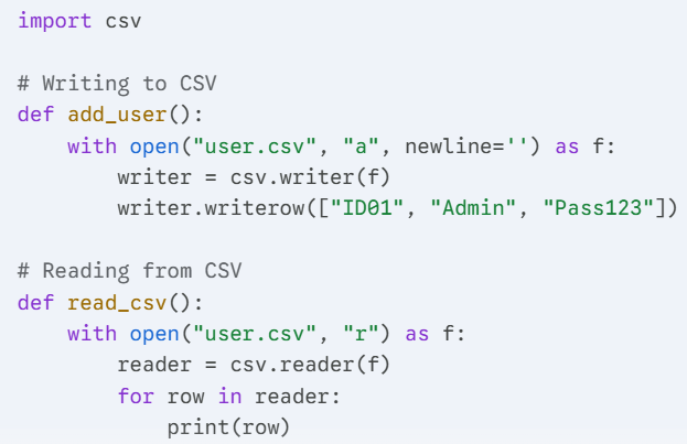 - CSV Files: Expect a case study or a 3-mark program to "Push" data into a CSV or search for a specific User ID.